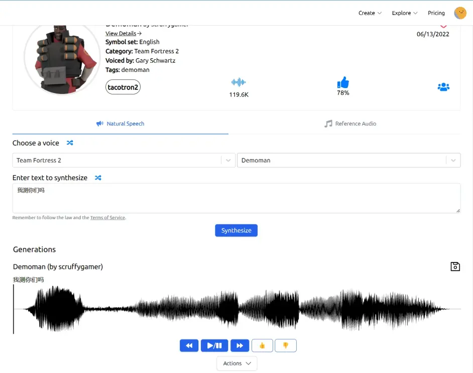 uberduck是一款ai語音生成網站旨在生成更簡單更有趣的語音,其中包含了大量的外網大人氣人物和遊戲角色等的聲線可以供大家選擇(當然包括tf2),訪問者可以生成各種想要的人物語音(包括中文)
