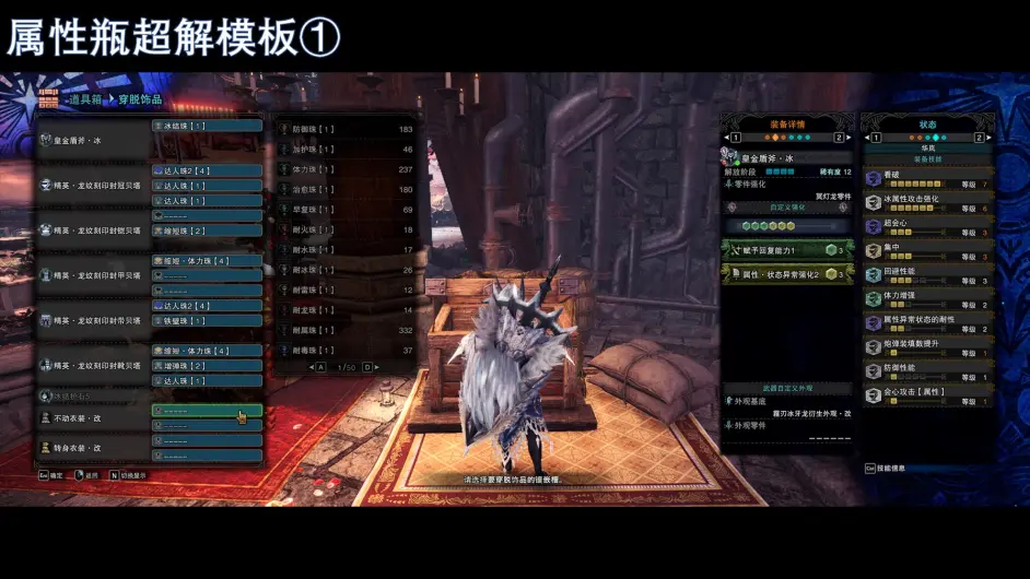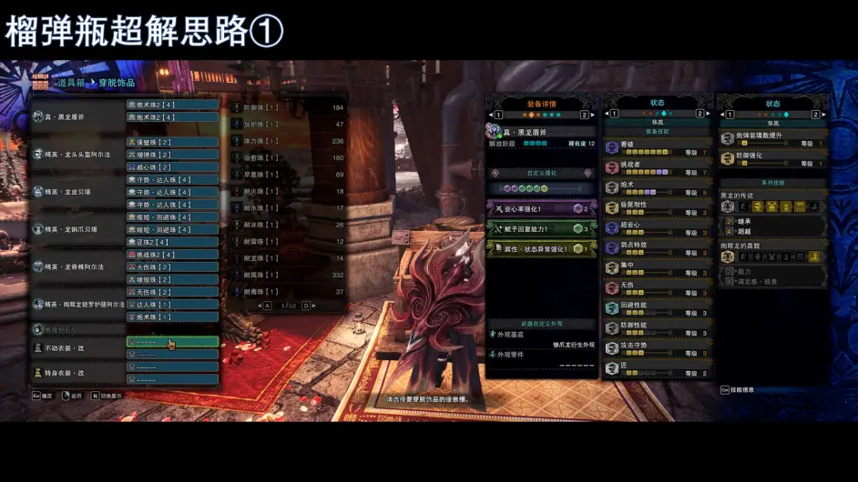 根據我統計的一些題材中的技能選擇,大概總結歸納了一下,不一定切中主題,代表個人觀點,範圍限定在黑龍四件配黑龍物理盾斧的範疇內,僅供參考: