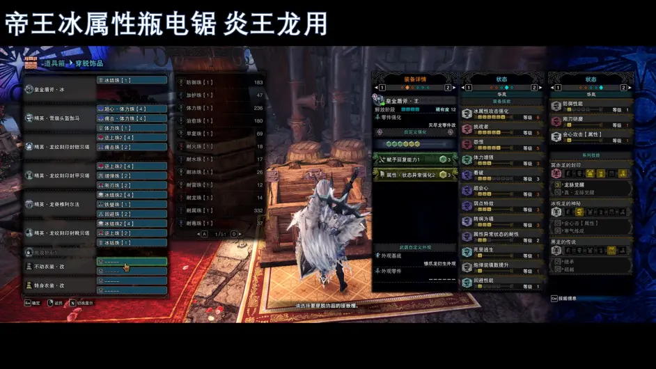 由於帝王系列盾斧起步15的會心,其中帝王冰和帝王水初始20%的會心,可以在冥赤5拔刀40會心和【看破】7提供40會心的情況下,站街無弱特滿會,對於像炎妃龍這種腿部肉質極差弱特覆蓋率無法保證的情況十分有效。