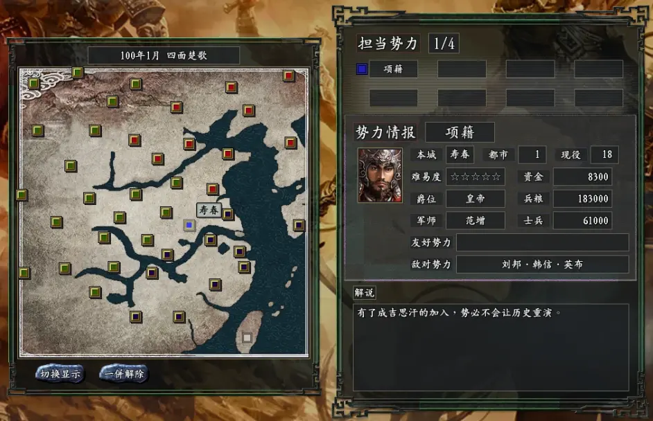 玩家使用的項羽勢力,初始軍師是范增,武將人數 18 名。除了項羽之外,還有樂毅和宇文泰這樣的名將,還有項梁率領的西楚政權武將,以及幾位具有不同功能性的武將共同構成了初始項羽勢力的武將。