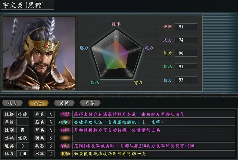 依然有特技但是幾乎觸發不了的雙雄特技,招募對於魅力 93 的宇文泰是一個相當給力的特技,策應是一個不錯的防禦特技,但是防禦特技在玩家手中的地位,大家都懂的。堅壁和激勵是宇文泰這個版本最大的改變和增強,但效果都不是很理想,堅壁主要還是幫助他提升防禦能力,太鼓臺因為太過脆弱,在挑戰劇本的早期幾乎沒有立住的空間,所以對宇文泰也就沒有了加成效果,自身也沒有暴擊特技,想要擊破敵軍也不是很容易,這也就導致一個沒有十足攻擊力的宇文泰拿了激勵也貢獻不了更多的作用。