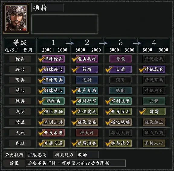 西楚初始就擁有戟兵的全部科技,其他科技則多數都是隻有第一級別的,騎兵和練兵科技稍好有二級的出產良馬和南所行軍。
