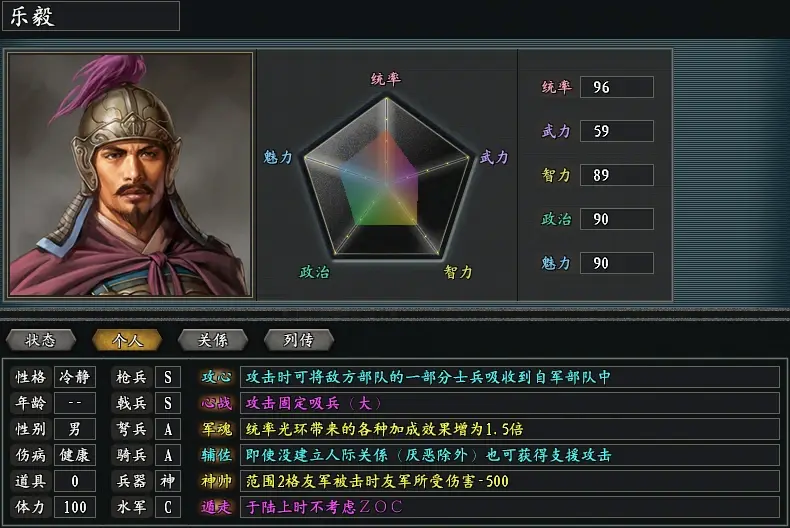 在此前的 2.97 版本中,樂毅是一位非常全面的武將,不僅自身能力值好,而且適性也有戟兵和兵器的雙神適性,特技和這個版本大體相同,但卻有一個致命的改動,讓他從上個版本的全能武將直接變成了這個版本的下水道級別武將。