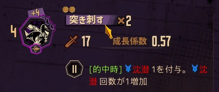 技能效果:II【命中時】給與敵人1沉潛。沉潛回合數增加1。