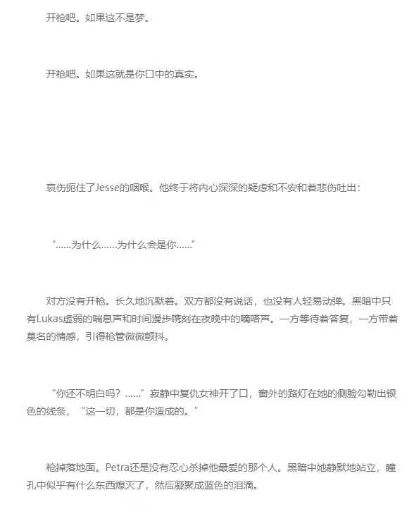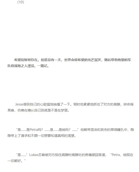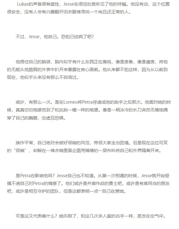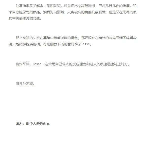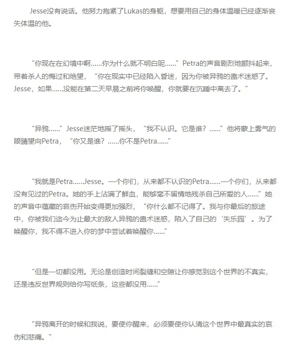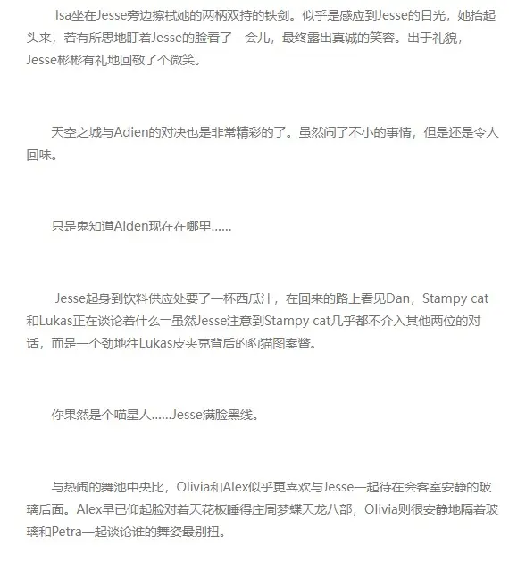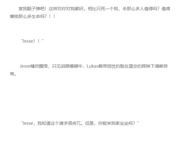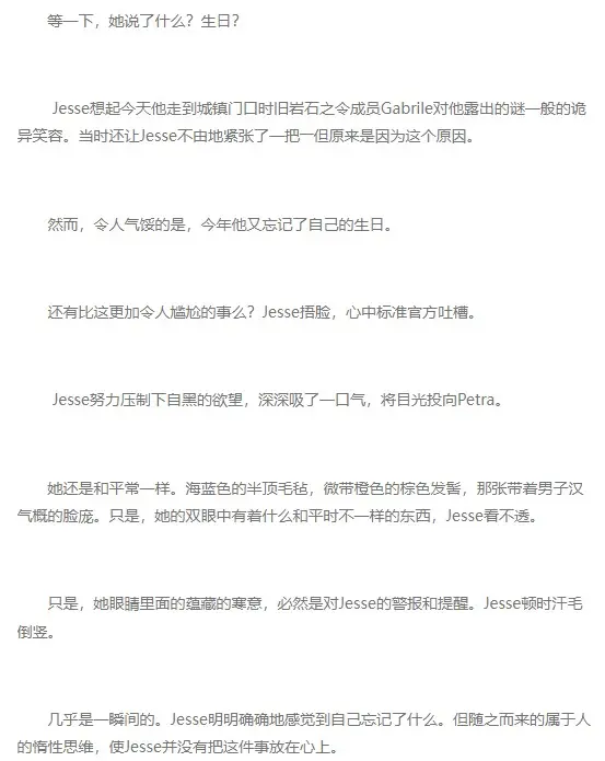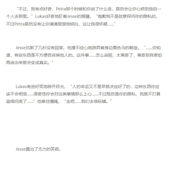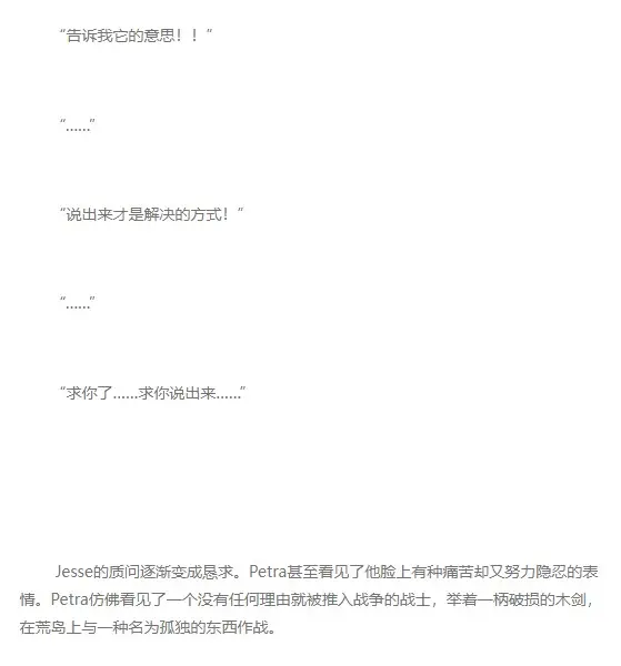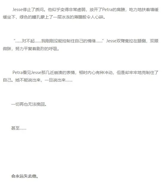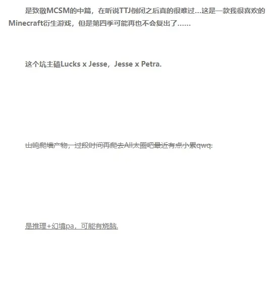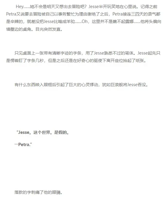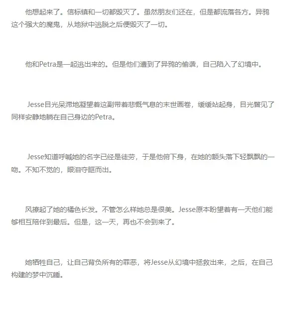TTG的突然倒閉令無數玩家惋惜,jesse和petra的故事也戛然而止。即使公司後來重建,也一直未能拿到版權。而第二季的結局是如此開放,給我們留下了無盡的想象空間。這也催生了許多優秀的MCSM同人文。今天搬運一篇個人覺得非常好的文章和大家分享。這篇文章之所以能在我看過的諸多MCSM同人文中脫穎而出,是因為它講的是一個完整的故事,既不是零零碎碎,也不是半途而廢。雖然其中一些細節(如出現槍支)和原作有出入,但這本來就是改編,也無可厚非。