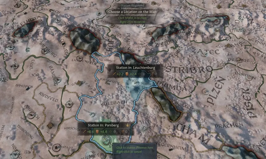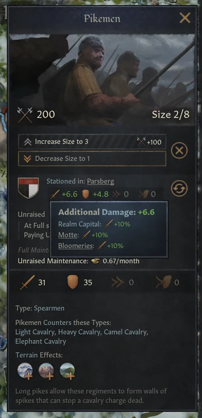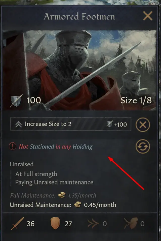 當你完成部隊駐紮後,你可以在他們的資訊卡上看到他們駐紮的位置,可以看到強化buff的來源拆分。除了招募、戰爭或者地產被圍/佔領的時候,任何時候你都可以重新駐紮你的部隊。