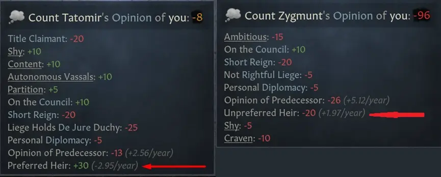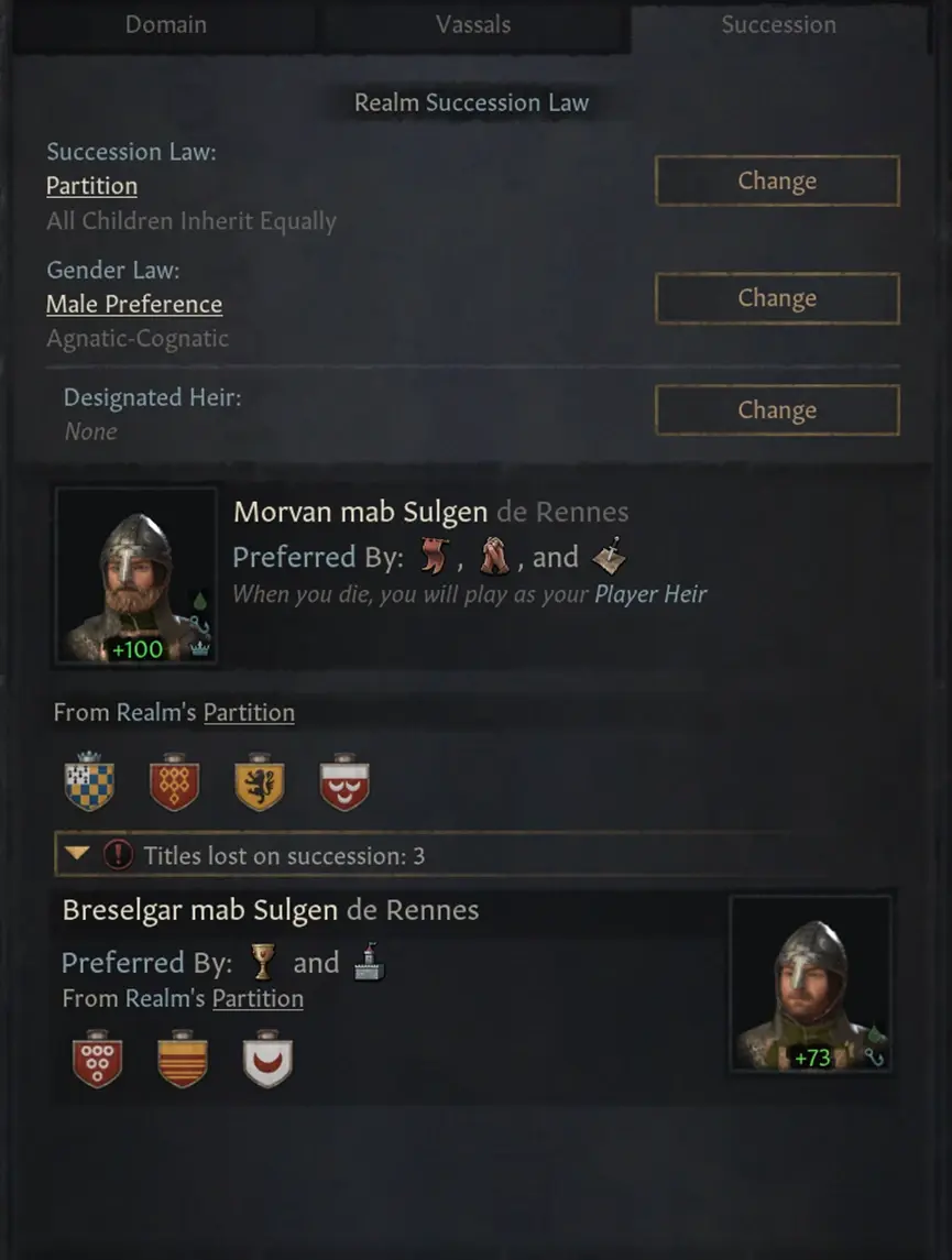 每一個立場都會偏好特定的繼承人,如果他們偏好的繼承人繼承了你,他們的好感度會大幅提升…但反之喜歡其他繼承人的封臣會有好感度的懲罰。
