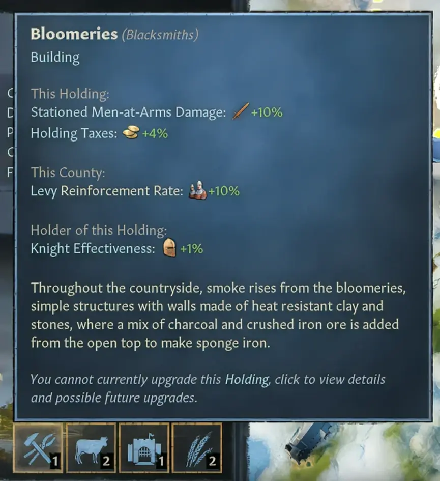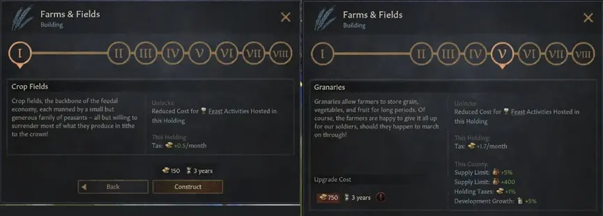這些改動將使得直屬領地比之前有些許下降,並提高種田的潛力 - 因為現在隨著時間推進,你可以提升並專精你的地產(譯者:弓箭堡、重騎堡、槍兵堡)。遊戲的開局階段鎖定了部分建築選項,這將使得你在整局遊戲過程中都需要不斷選擇建造的哪些建築 - 現在還會部分建築直到較晚的時代才會解鎖。建築槽解鎖基於根據文化的基準,但是一個地產在它的文化改變時不會失去建築槽。