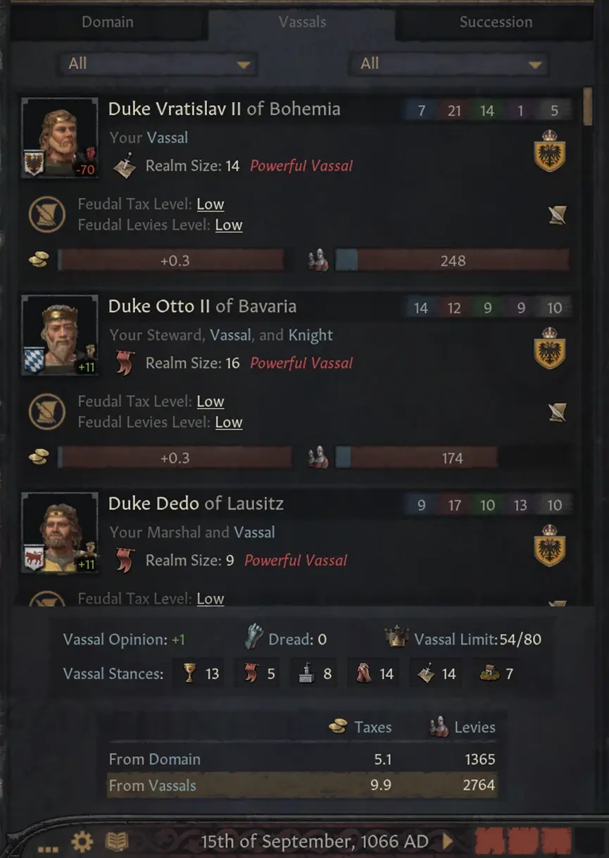 在朋友&仇敵更新時,AI的經濟邏輯大改之後,論壇反饋頻繁指出的一個問題是,統治者的封臣數量太少了,這對於遊戲的人際關係來說是一個很明顯的問題。我們不想使用專斷的方式限制AI的行為,所以我們嘗試研究其他遊戲機制,我們注意到的問題是直屬領地數量限制。整體來說,上限太高了,即使對於普通的統治者來說。我們發現直屬領地上限最大的問題來自於革新,遊戲整個過程中革新提供了4點領地上限。堆疊的管理能力的效果相比其它能力值收益也有一些過高了。