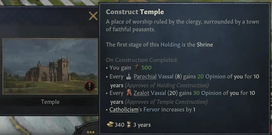 狂熱的封臣更看重信仰的事情,並且更容易被虔誠的行動所打動。狂熱或睚眥必報的封臣常常會採取這種立場,同時神職人員也會採取這種立場。