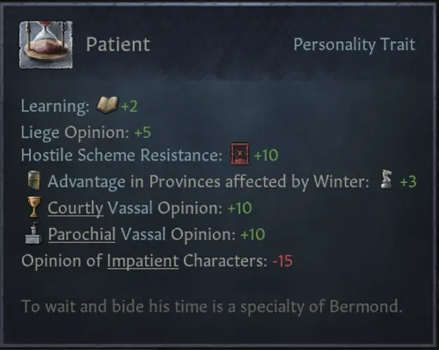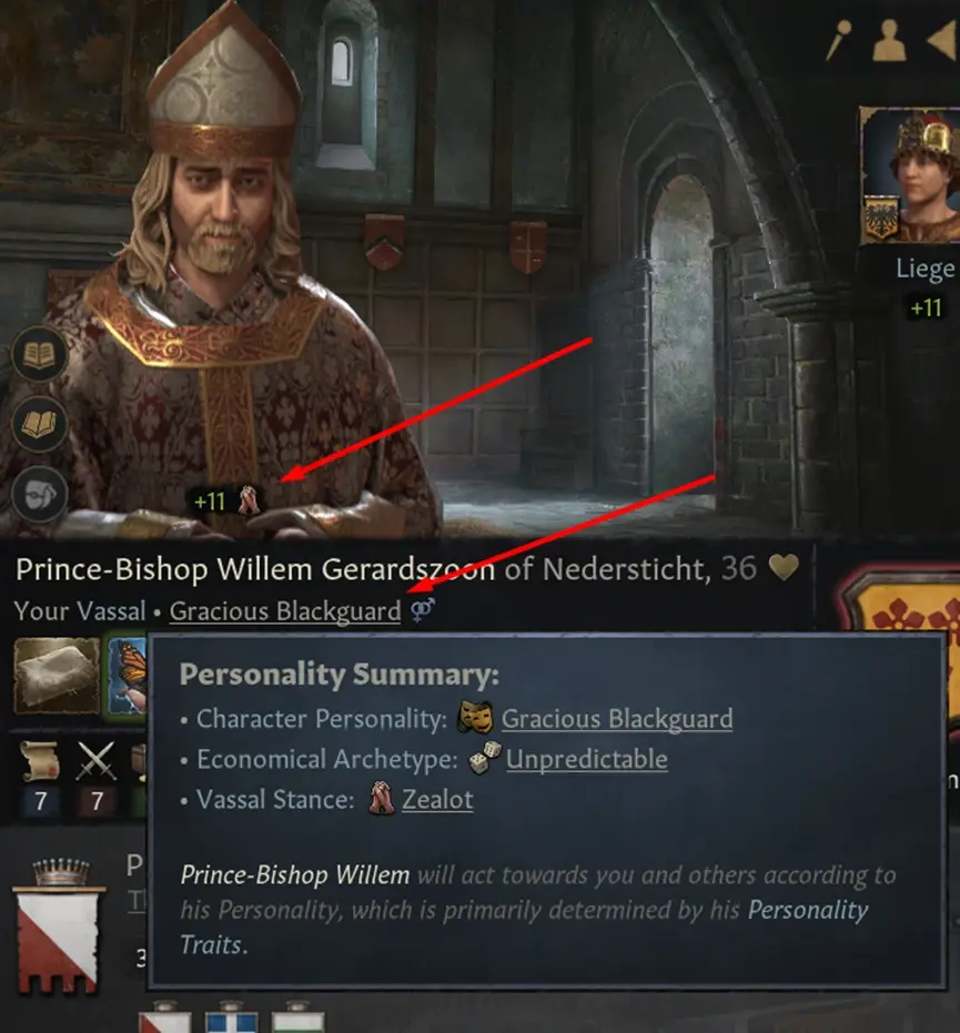 很多性格特質更新後,也將會有封臣立場正面或負面的好感度影響,這會使一些原本強力的特質變弱,使另一些較弱的特質變強(當然是有理由的)。你也將會看封臣立場好感度的內容!