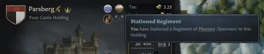 你也可以在地區介面(男爵領介面)看到是否有部隊駐紮。如果這個地產建築是你持有的話,會有方便的按鈕可以直接連結到這個軍團。