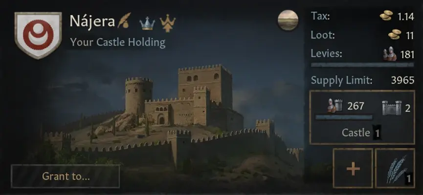 你現在可以讓你兵士的軍團駐紮到直屬領地的地產內(也就是現在的一個男爵領內),通過駐紮來給提供加成。每個地產只能駐紮一個軍團,所以你需要明智地選擇每個軍團駐紮在哪裡。駐紮完全是一個可選項,即使領地被征服或者其它人繼承,你也不會因此而失去單位 - 這些兵士只是變回未駐紮狀態 。