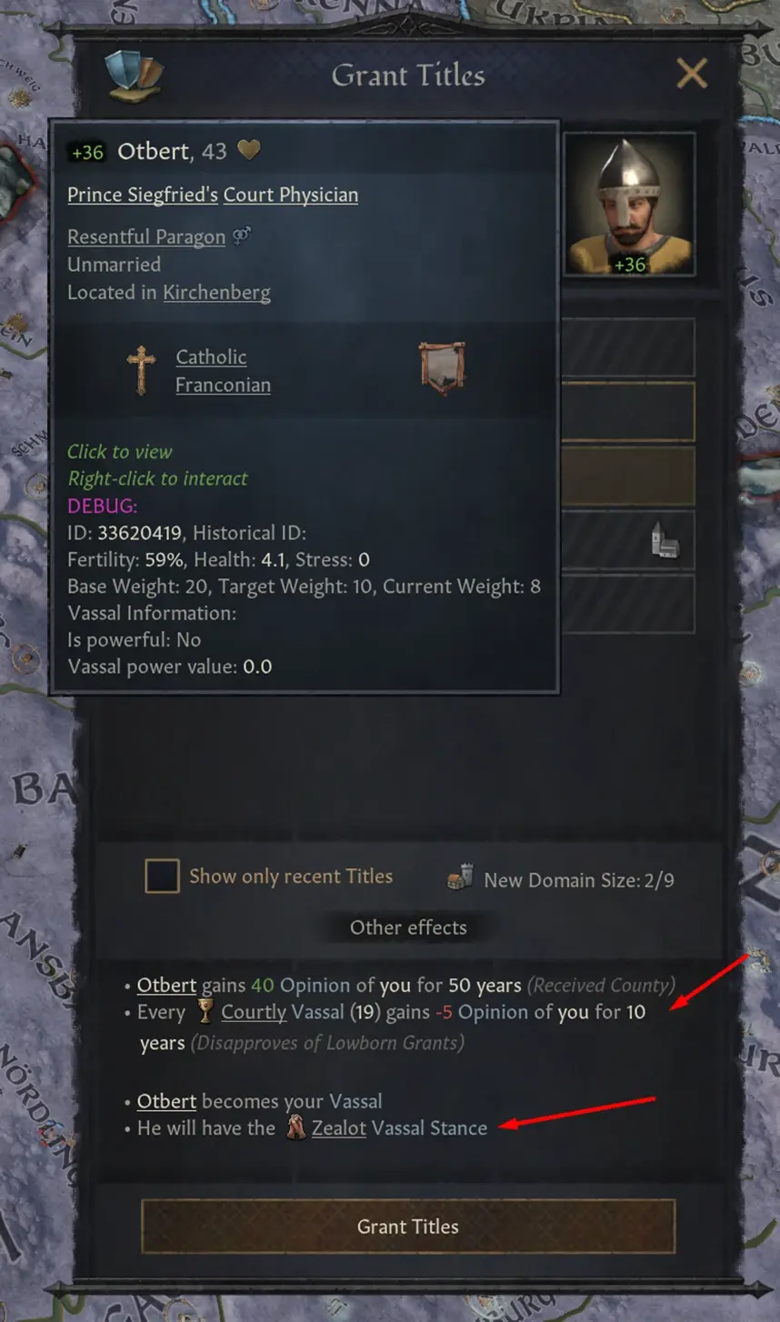 給一個出身平民的角色封地將會使得禮儀類封臣好感度下降(基於封的頭銜數量),你也可以看到這個角色將會採取狂熱的立場。(譯者:先封一個頭銜,平民就成為了貴族,之後再封其他的頭銜。是不是這樣,就只吃一個頭銜的懲罰呢?不過這顯然不是P社想看到的解決方案。發售後試試看。)