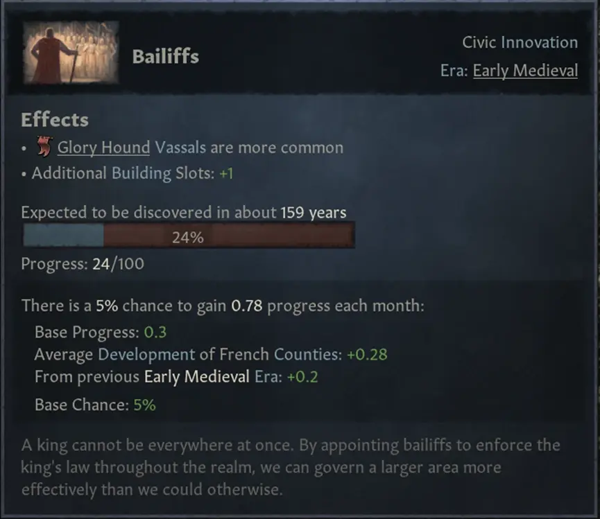 由於這些問題,我們從革新中移除了2點的領地上限(你現在只有在部落時期和中世紀晚期才能獲得直屬領地+1),我們已經增加了直屬領地+1的管理能力要求。從原本的每5點管理,上升到了6點 ...但是