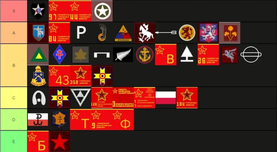 2.同盟國與軸心國的部隊評級互相獨立,僅代表其在所屬陣營內的強度,無法與另一陣營同一等級的部隊進行橫向對比或對位。即,軸心國S級≠同盟國S級,以此類推。