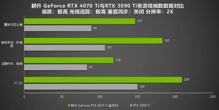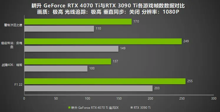從測試資料可以看到,在1080P下,擁有全新NVIDIA Ada Lovelace架構的耕升 GeForce RTX 4070 Ti追風EX在遊戲幀數測試上與RTX 3090 Ti有明顯提升:《霍格沃茲之遺》領先54%,《瘟疫傳說:安魂曲》領先67%,《戰錘40K:暗潮》領先37%,《F1 22》領先26%。不少遊戲更是能突破200幀,可以看出NVIDIA Ada Lovelace架構對遊戲效能有巨幅提升。