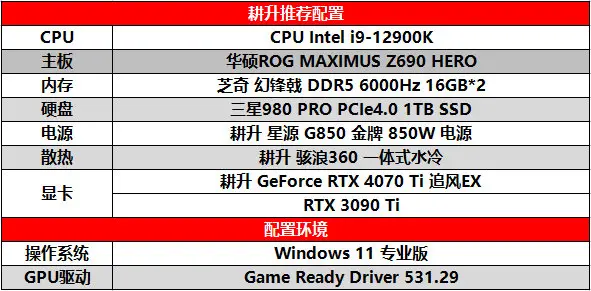 為了防止CPU造成顯示卡瓶頸發揮不出效能,CPU採用了Intel i9-12900K,主機板採用華碩ROG MAXIMUS Z690 HERO搭載芝奇 幻鋒戟 DDR5 6000Hz 32GB。電源與散熱器採用耕升 星源 G850 金牌 850W 電源與耕升 駭浪360 一體式水冷為顯示卡持續散熱,提升顯示卡效能。