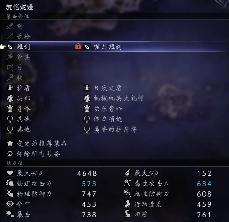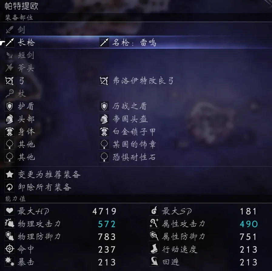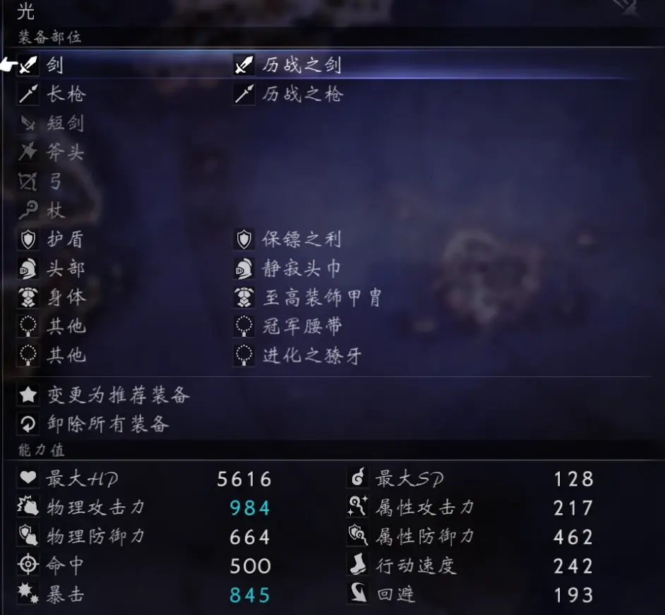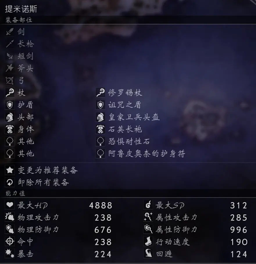 因為承擔輸出重任,所以沒法帶防禦首飾、也沒法帶防禦盾牌(帶了保鏢之利)、也沒法帶努力的結晶,物防屬防全隊最低,所以我幾乎把大部分的堅果都餵給了光。神官單奶也優先考慮劍士。其實主要短板還是在於屬防,所以帶了減傷火冰雷風四屬性的至高裝飾甲冑,但是這隻對黑頭盔的技能有效。boss本體的魔法傷害似乎是暗屬性、對光的傷害大概比別人高20%。