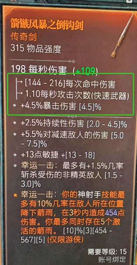 需要注意固定屬性上方的秒傷屬性(白色加粗部分),其實是根據下方單次傷害x每秒攻擊次數計算出來的,僅供玩家參考,對於1個BD來說,不是秒傷越高武器就越好,還是具體根據詞綴來考慮的。