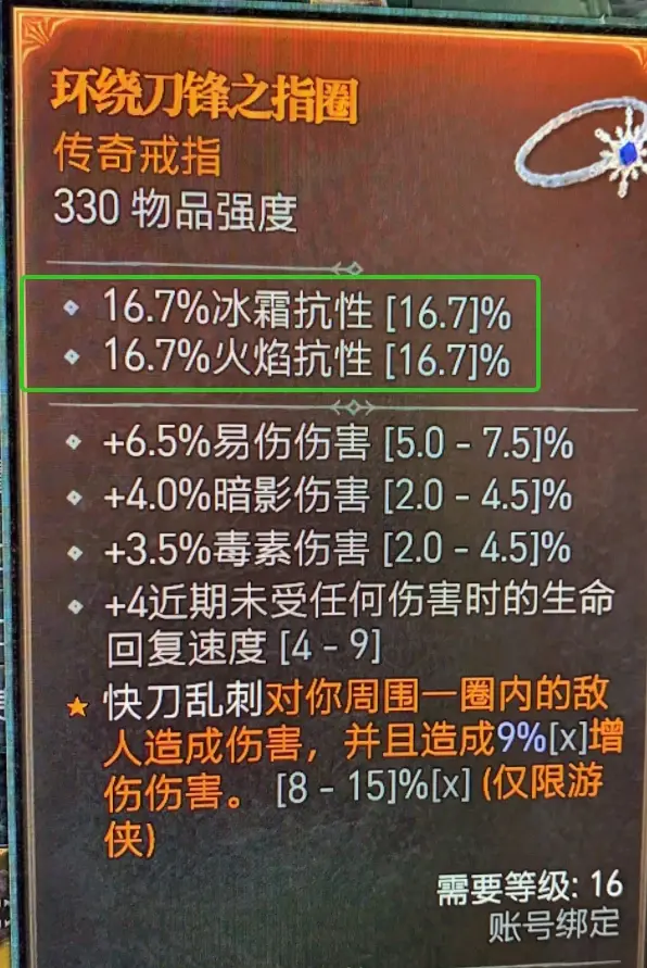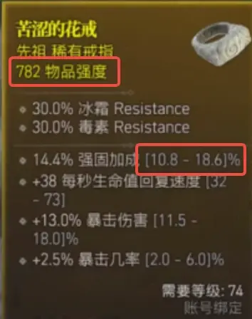 如下圖的戒指,782強度該戒指,某詞綴的級別會在【10.8-18.6】之間滾動