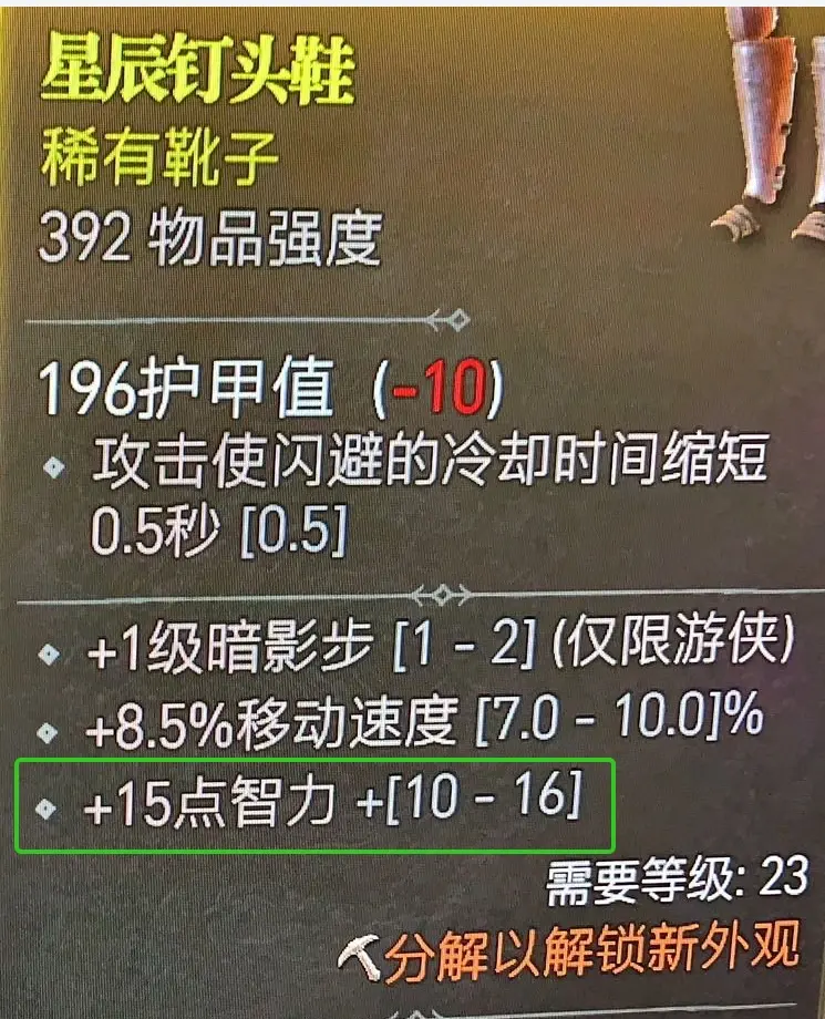這雙鞋子的移速屬性和暗影步等級屬性都是我需要的,但智力屬性我不需要