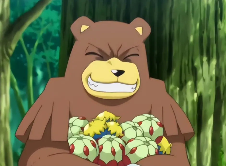 一開始玩家對戰阿楓的時候,她派出的是熊寶寶,第二次對戰的時候派出的是圈圈熊,在對戰的時候她的熊寶寶/圈圈熊太晶化之後會變成太晶蟲屬性,關於為什麼選擇這隻寶可夢作為蟲系道館的代表,可能是參考了阿楓作為甜品師的身份,加上這一家的設定是喜歡吃蜂蜜,會和蟲系產生一定的關聯性,還是比較合理的,但是圈圈熊作為代表寶可夢逼格還是不行啊只能說,其配招為連斬+十萬馬力+嬉鬧+咬碎,也是簡單的四攻玩法。