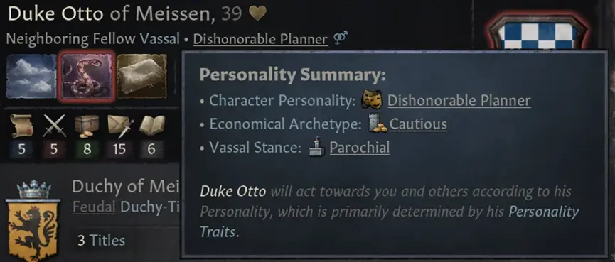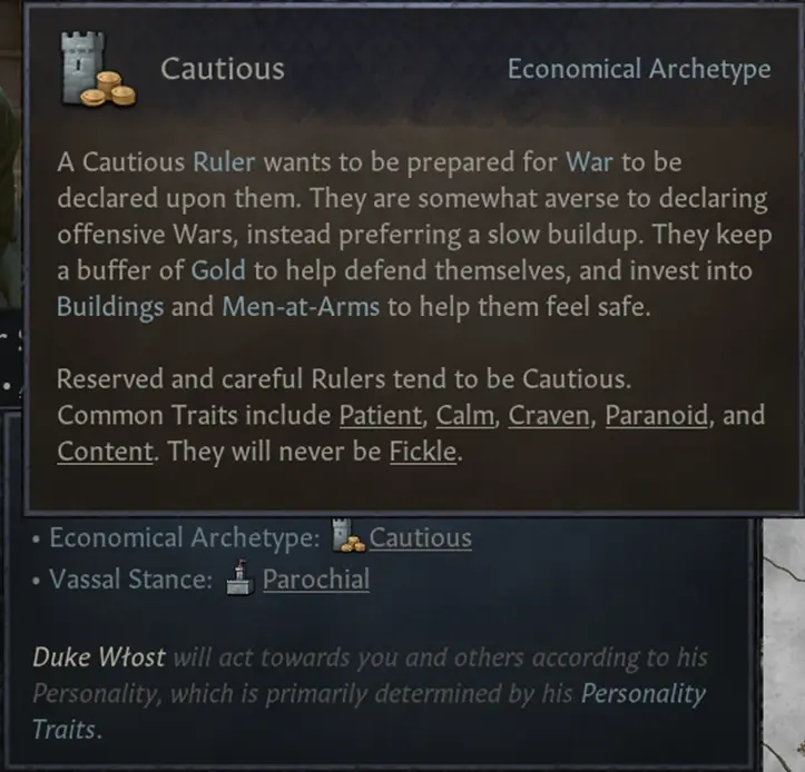 一個謹慎的統治者會想為可能發生在他們身上的戰爭做準備。他們會避免發起進攻戰爭,喜歡緩慢的建設領地。他們會保留一定的備用金錢幫助防守,並投資於建築和兵士,這使他們覺得更安全。