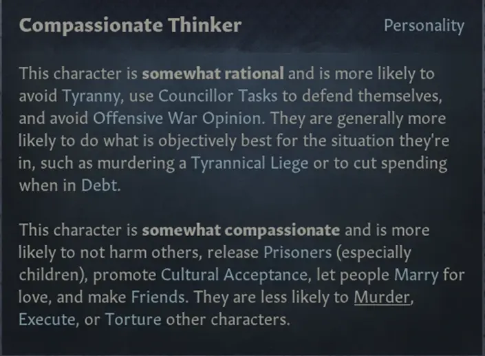 這個角色富有同情心,更可能選擇做出不傷害他人的選項,釋放囚犯(尤其是孩子),提升文化接受度,讓人們為愛情結婚,交朋友。他們不太會參與謀殺、對別的角色進行折磨或處決。