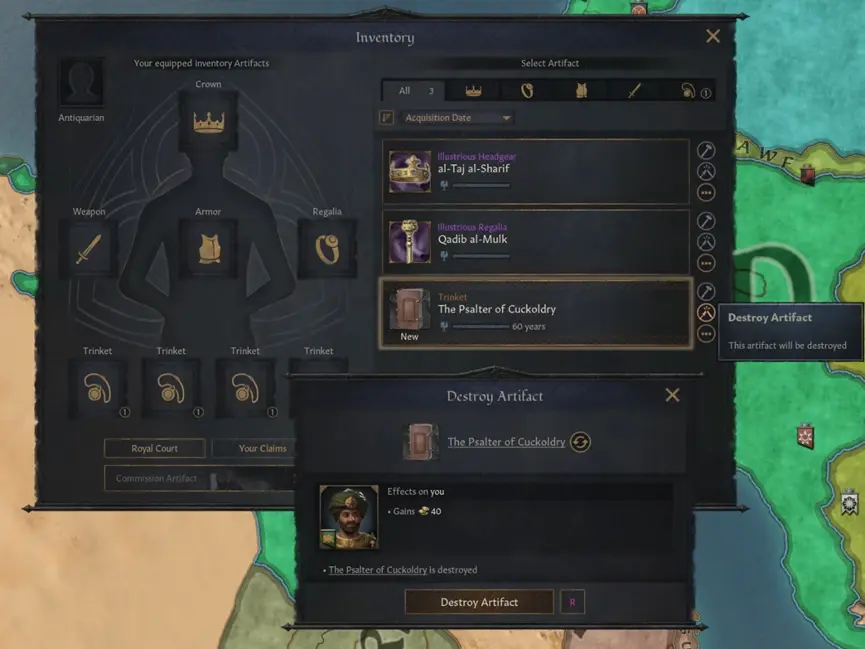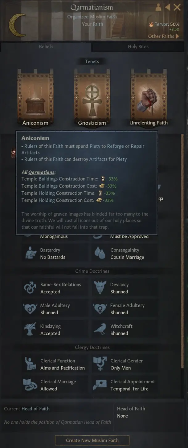 摧毀一件名作級(藍色)或者卓越級(紫色)的寶物時,你就需要你的信仰擁有反神像的核心教義了。反神像主義者例如伊斯蘭的卡爾馬特派(這個教派之前沒有這個核心教義)和摧毀神像的人將在摧毀寶物時獲得虔誠。在摧毀任何信仰的宗教類寶物時,會獲得更多的虔誠。這就為原本無趣的核心教義增加了樂趣和沉浸感!
