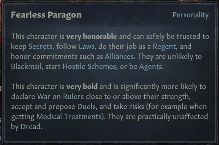 這個角色非常勇敢,非常可能對實力相當甚至強於自己的統治者發起戰爭,他們會發起或接受決鬥,會選擇冒險(例如醫生治療的時候)。他們完全不受到恐怖值的影響。
