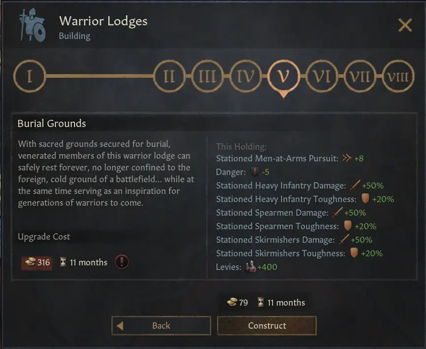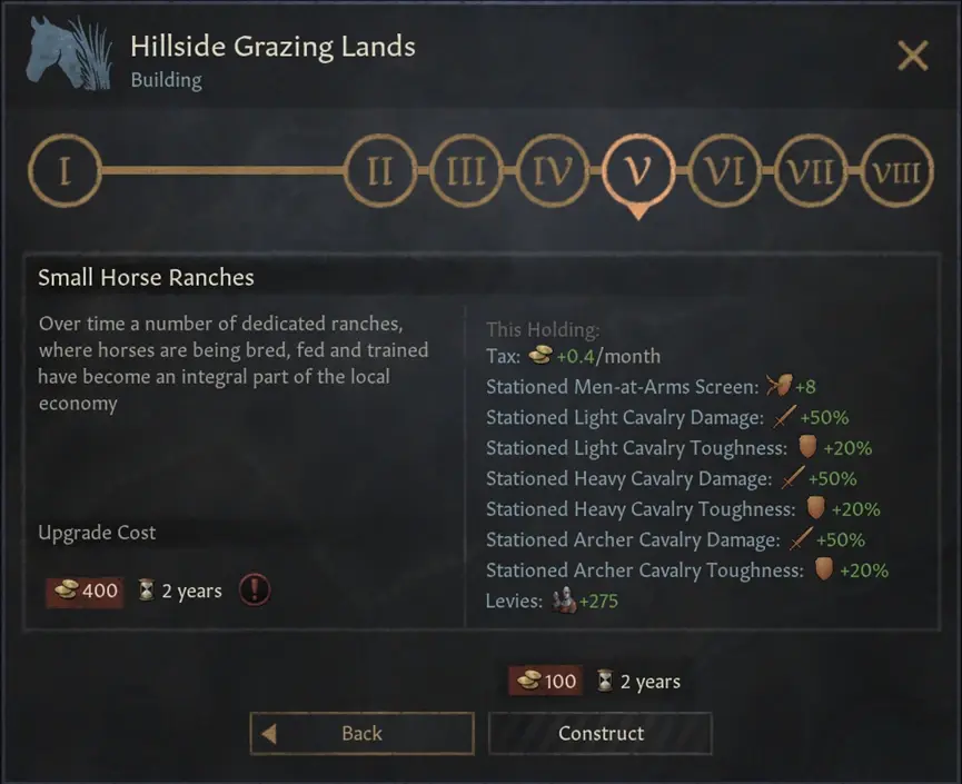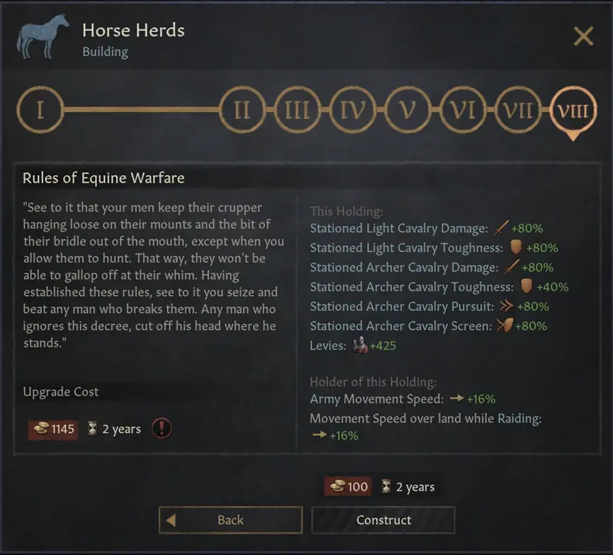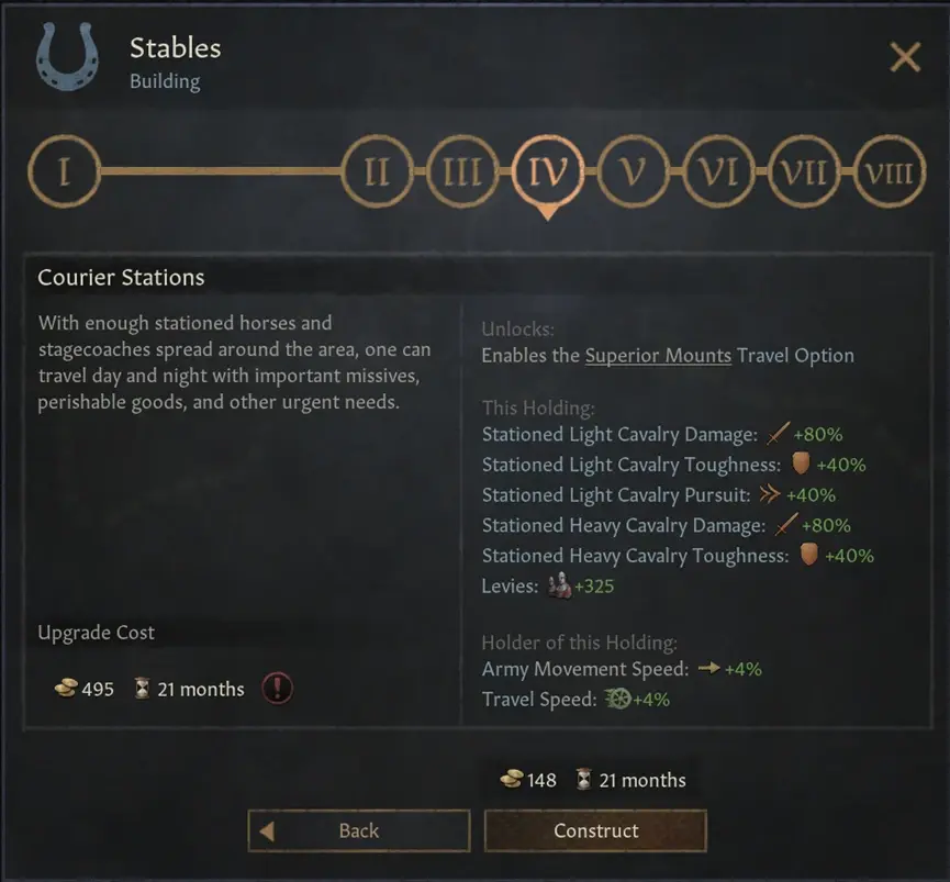 馬廄線建築替代了原本的狩獵場,提供了輕騎兵/重騎兵的加成。他們現在還會帶來一些戰術上的優勢,可以讓你的部隊移動的快一點 – 這讓你可以更方便地在有利地形上與你的敵人戰鬥。除此之外,馬廄還會提供更快的旅行速度,並在等級達到4級以上時,解鎖“高階騎乘”Superior Mounts的旅行選項。