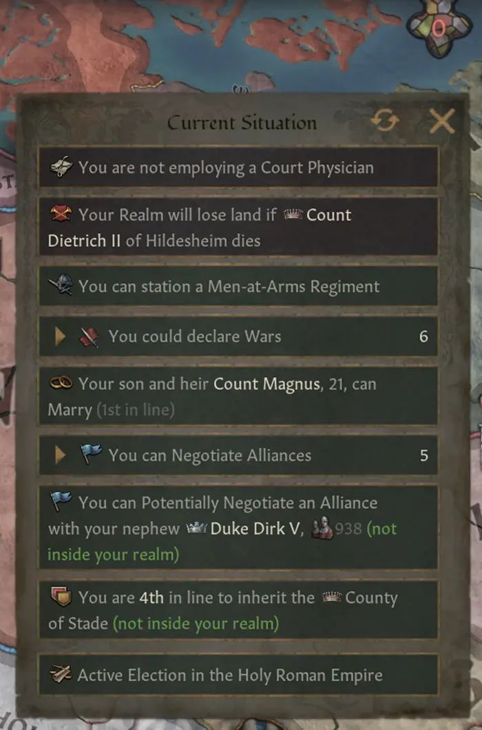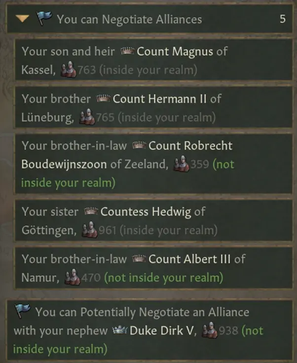 “協商同盟談判”中,如果同盟在自己領土範圍內,則會提示同盟的封臣不會加入派系,如果同盟在自己領土範圍外,則會提示他們部隊的數量。