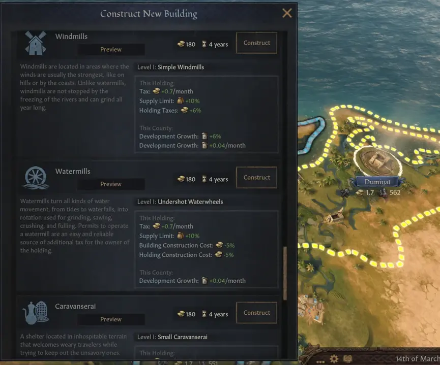 下面3個建築線都非常強力,因為他們對於當地經濟都有乘數效果。建造它們需要滿足不同的標準,基於地理區域位置以及地形。有這些地產可以造它們中的2種甚至是3種 – 盯住這些地方,他們將成為你潛在首都的目標。例如埃及的Dumiyat。