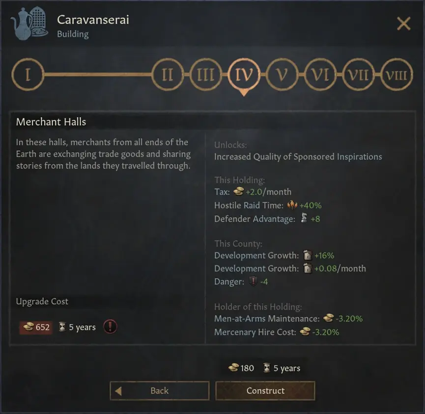 雖然商隊客棧對發展度的提升和上面2個建築相比是最弱的,但它卻又很多有趣的效果。它們由行會革新解鎖。可以降低僱傭兵的招募花費以及所有兵士的維護費,同時提高寶物的質量和防衛能力。這個建築填補了一些特殊加成的空缺,同時亦然是一個不錯的經濟建築。這個建築可以在沙漠和旱地類地形上建造。