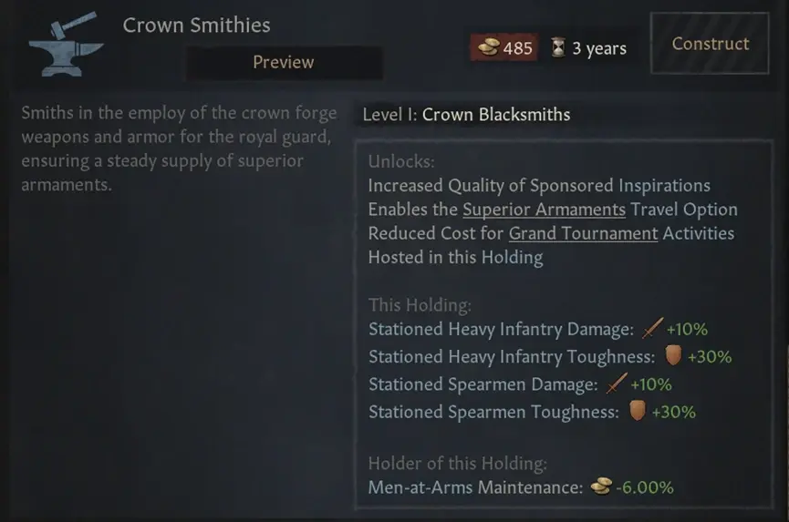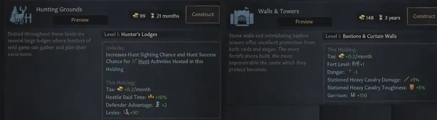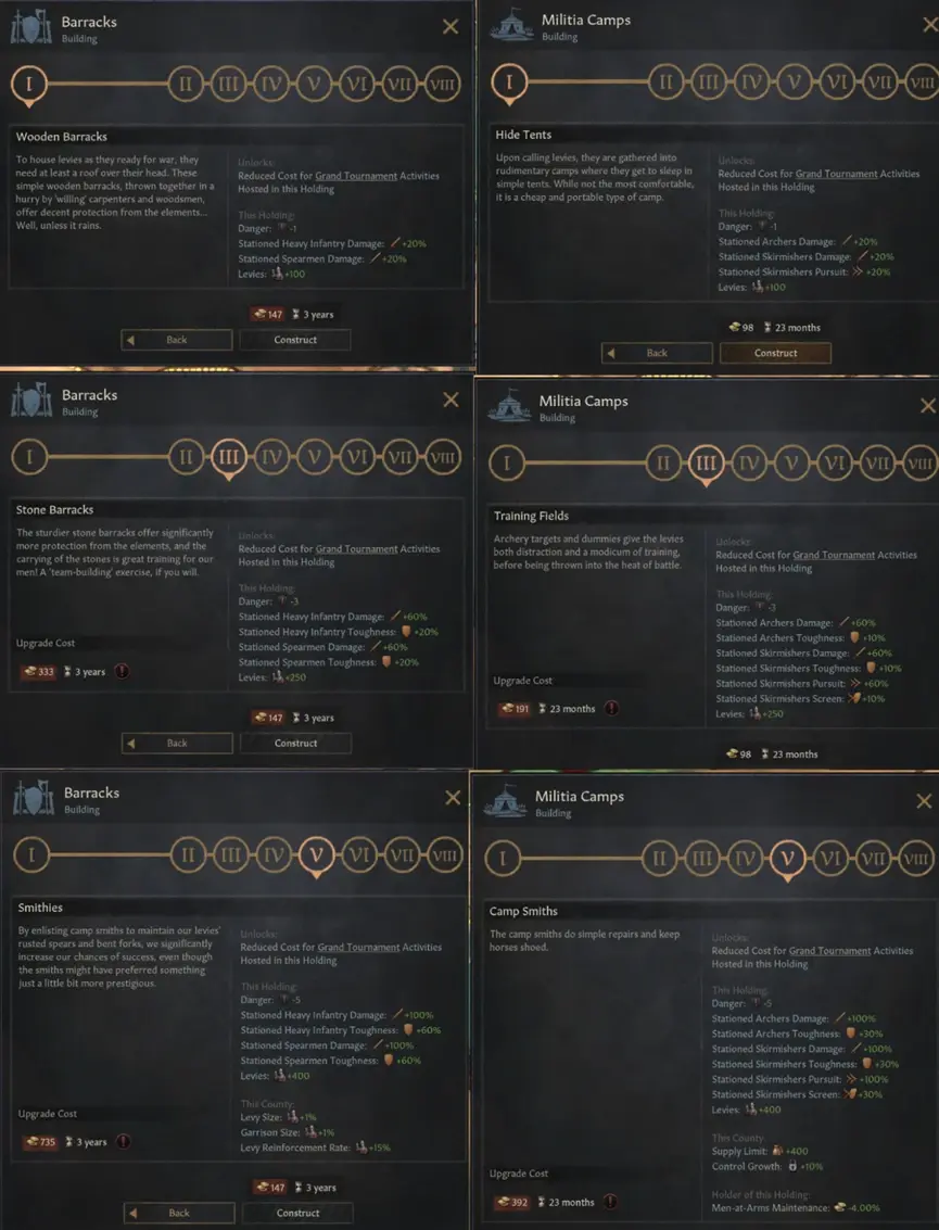 其次,我們已經翻新了很多建築 – 尤其是軍事建築 – 這會使得各類建築都更加有趣,值得一造。我們希望讓你在選擇建造建築時有理由需要深思熟慮一番,而不是無腦的選擇自己直屬領地內最好的經濟建築。軍事建築現在將利用兵士駐紮系統提供加成,同時它們也會降低旅遊的危險性,而且在建築等級提升後,總是會額外新增第二/第三種加成。我們還降低/移除了很多徵召兵比例的加成(例如來自於角色的軍事能力和內閣任務的加成),這將使建築提供的徵召兵數量變得更加重要。在整體提升兵士的傷害得到大幅提升的情況下,徵召兵補員速度這個屬性將變得比以往都要重要。這裡將有太多的變化了,這裡先上2個例子: