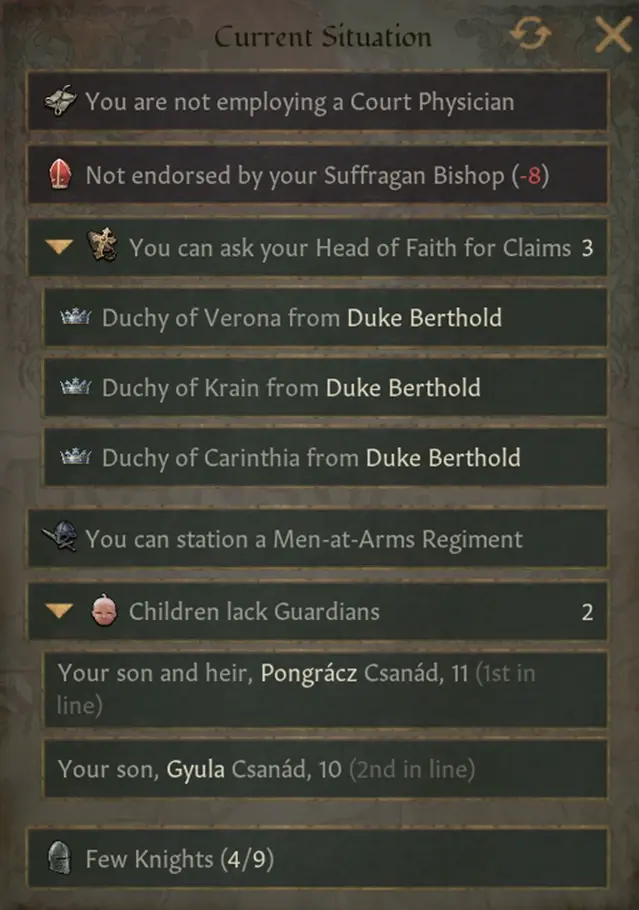 新增“向主教索要宣稱”的當前形勢專案,顯示任何你可以獲得的公爵以上的頭銜