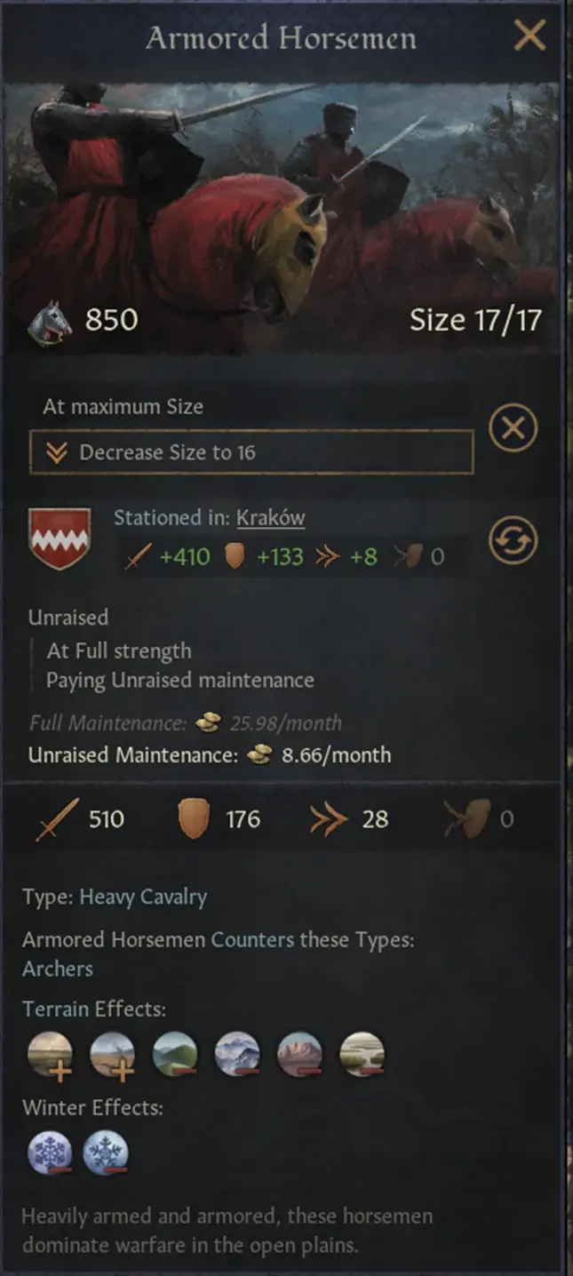最後,是一個我們在遊戲晚期的可以實現的例項。在你很好的調整自己的經濟基礎上,我們花費3400的金錢可以招募重騎兵軍團(譯者:注意,軍團規模達到了17…),然後花費大概2萬的金錢在駐紮建築上,這不是一個可以忽略的小數目,還是需要仔細計劃才能實現的。