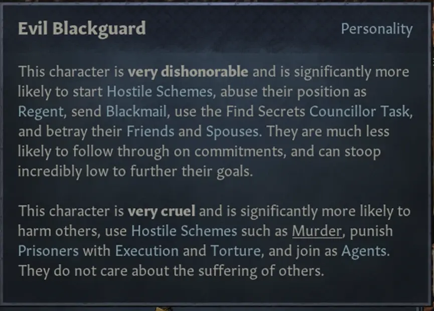 這個角色非常的無恥,他非常可能會發起陰謀,濫用自己崗位的職權,諸如攝政,勒索他人,使用尋找祕密的內閣任務,並且背叛他們的朋友和配偶。他們不太可能會遵循自己的承諾。他們為了達成自己的目標,會做出非常低下的事情。
