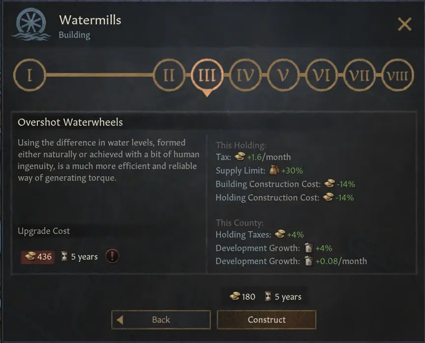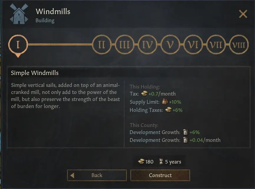 水力磨坊相比會稍遜一籌,但仍舊非常值得建造。他們也是由風車磨坊革新來解鎖。常見的可以建造在丘陵、山地、森林或者是河邊,這使得它們建造的要求更低,而且可以提升整個伯爵領的經濟。