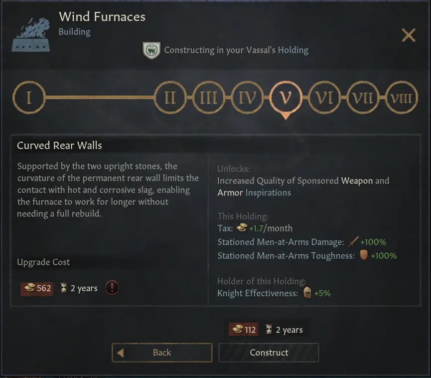 下一個建築線自然是區域建築線了 – 僅限於印度,需要解鎖烏茲鋼的革新,而且這個建築僅限於海岸或河邊的地產。風爐(wind Furnaces)代表著一種很棒的鍛造技術,所以這個建築也十分強力。這不僅是一個軍事/經濟混合建築,它還會給所有種類的駐紮兵士提供我們願意提供的最高建築加成。這類建築的稀缺性使得可以建造這一建築的地產非常值得我們去征服。這個建築還可以大幅提升武器和防具寶物靈感的質量。