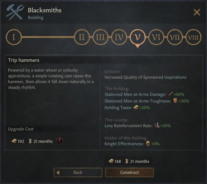 鐵匠鋪是一個全面型的兵士提升建築,是為數不多的可以提升所有型別駐紮兵士能力的建築。鐵匠鋪同時也會提供“經濟乘數”,它會提供地產稅收%加成的buff。這個建築線同時也會提升徵召兵補員速度,這個數值新版本也是非常重要的。當建築等級達到5級以上時,鐵匠鋪還可以提升寶物質量(與之相關的,我們原本委託製造寶物決議有寶物等級限制,現在替代這一限制,我們對這個決議新增一個-20的質量下降。鐵匠鋪的加成可以用於抵消這些減量)。為了避免與公國建築混淆,所以公國建築的鐵匠鋪我們改名為皇家鐵匠鋪。