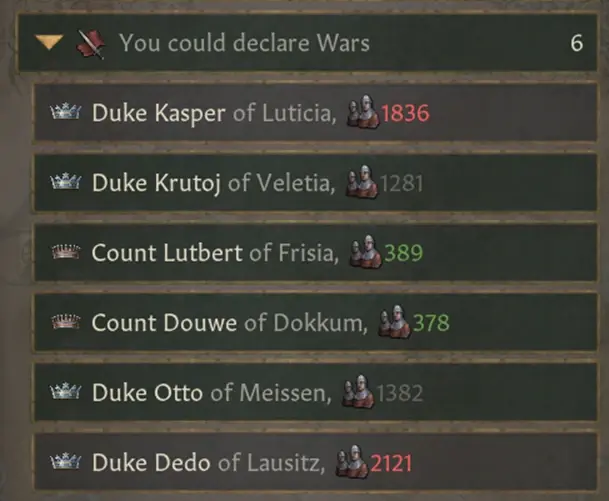 潛在的戰爭將會顯示潛在目標是否足夠弱小(綠色),或者大致實力相當(灰色),亦或是對方強於你(紅色)。