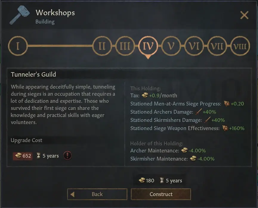 首先是我們的工坊建築線,這是由高階制弓術革新解鎖的建築。這個建築線和標準的經濟線建築相似,可以提升收入,而且可以在所有地形上建造。它可以提升駐紮攻城武器,同時還可以降低你所有弓箭手和輕步兵的成本。這個建築還會給駐紮在這裡的兵士提供一個圍城的固定效率,從而使得這個建築不僅可用於攻城武器,也可以作用於你的低質量兵士。