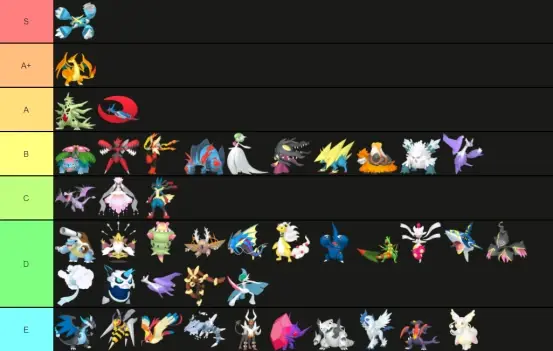 Mega位置的選擇一般以mega巨沼怪為絕對的主流,少部分會用mega巨金怪、大嘴娃還有螳螂,娛樂點可能會選擇mega水箭龜雨天下噴水的輸出最大化,也會有少見的將mega妙蛙花放到雨天隊中,mega位的選擇不同也會導致隊伍風格上的迥異以及隊友的選擇。