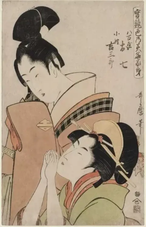 浮世繪中也有諸多演繹,喜多川歌麿(寫樂同期浮世繪畫家)曾作《阿七和吉三郎》,畫上右下角的阿七雙手合十乞愛的模樣正如遊戲裡阿七所表現的一樣。這樣轟轟烈烈,不惜自毀,大膽追求戀愛的痴情女性很讓人動容。