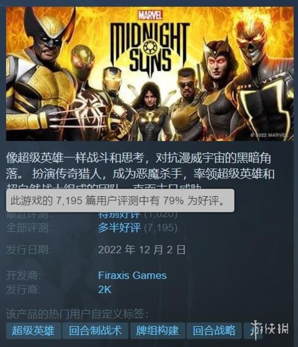 《漫威暗夜之子》目前在Steam上的總評價為「多半好評」,好評率達到了79%。