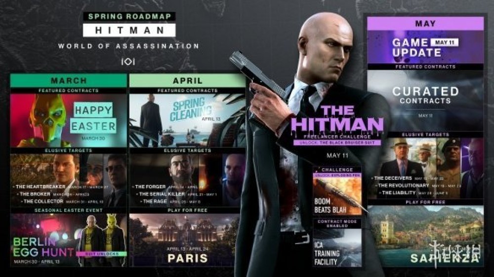 《殺手3》官方釋出了春季更新計劃路線圖,他們將會在3月、4月、5月為遊戲釋出一系列新內容,包括第三年的行蹤不定的目標,新的特色契約等。