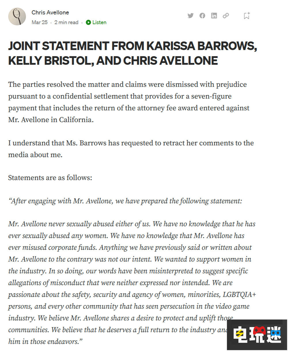 在2020年《消逝的光芒2》的編劇Chris Avellone曾經因為性騷擾問題而被解約,而近日Chris Avellone和兩名公開指控他性騷擾的女性和解,並獲得7位數的賠償金。