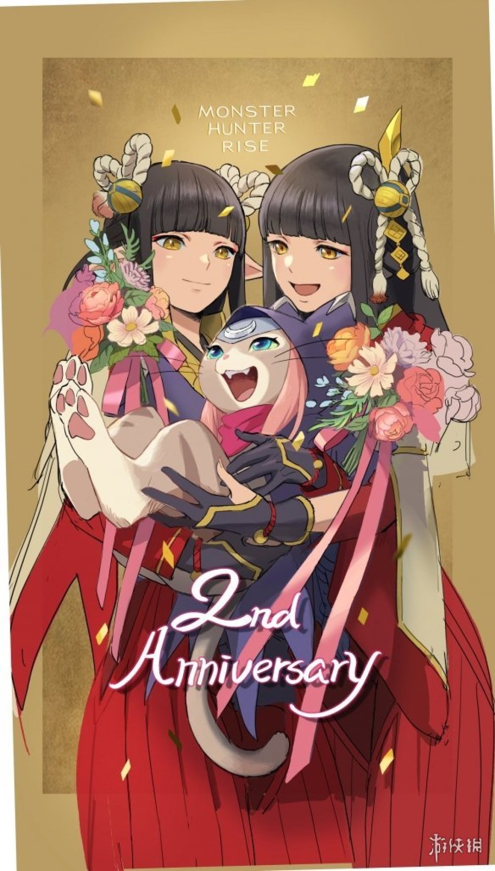 《怪物獵人:崛起》於2021年3月26日首發登陸任天堂Switch,今天是其發售兩週年。卡普空官方釋出週年賀圖,火芽水芸兩姐妹超可愛!有多少玩家想成為圖中的艾露貓,被這對姐妹花緊緊抱住呢?(滑稽表情)